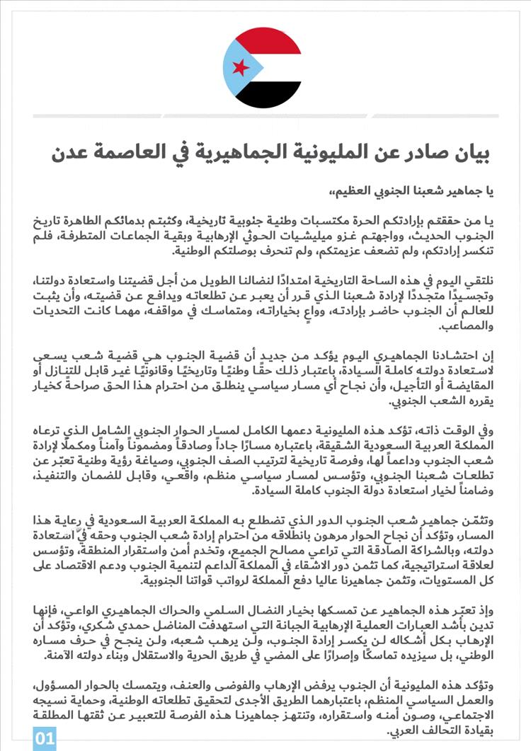 وفي الوقت ذاته، تؤكد هذه المليونية دعمها الكامل لمسار الحوار الجنوبي الشامل الذي ترعاه المملكة العربية السعودية الشقيقة، باعتباره مسارًا جاداً وصادقاً ومضموناً وآمناً ومكملًا لإرادة شعب الجنوب وداعماً لها، وفرصة تاريخية لترتيب الصف الجنوبي، وصياغة رؤية وطنية تعبّر عن تطلعات شعبنا الجنوبي، وتؤسس لمسار سياسي منظم، واقعي، وقابل للضمان والتنفيذ، وضامناً لخيار استعادة دولة الجنوب كاملة السيادة.
